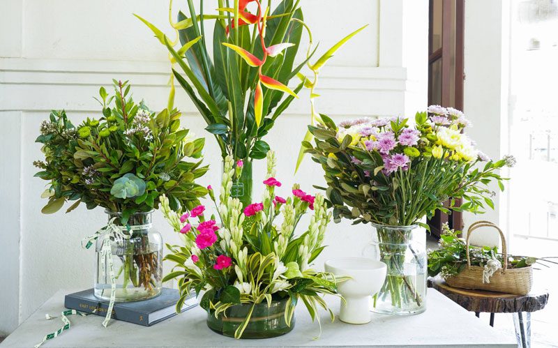 بهجای استفاده از گلدانهای ایستاده، میتوان گلها را در سینیهای چوبی یا سبدهای حصیری مرتب کرد.