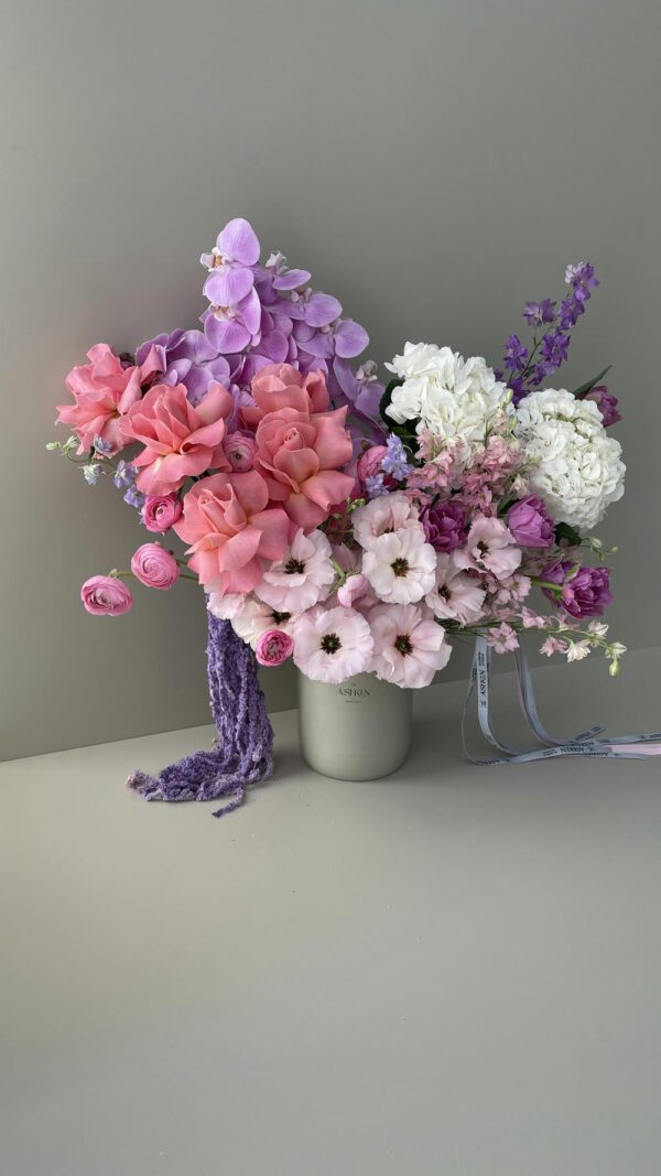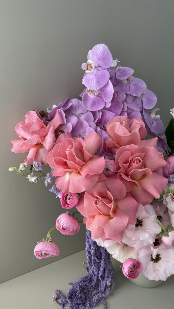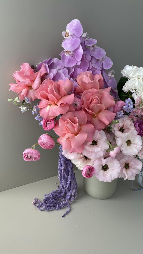 • گل‌های به کار رفته در این دیزاین: گل رز هلندی با دیزاین اختصاصی ولنتاین سکرت، لیسینتوس، ارکیده، هورتانسیا، آنمون و لاله