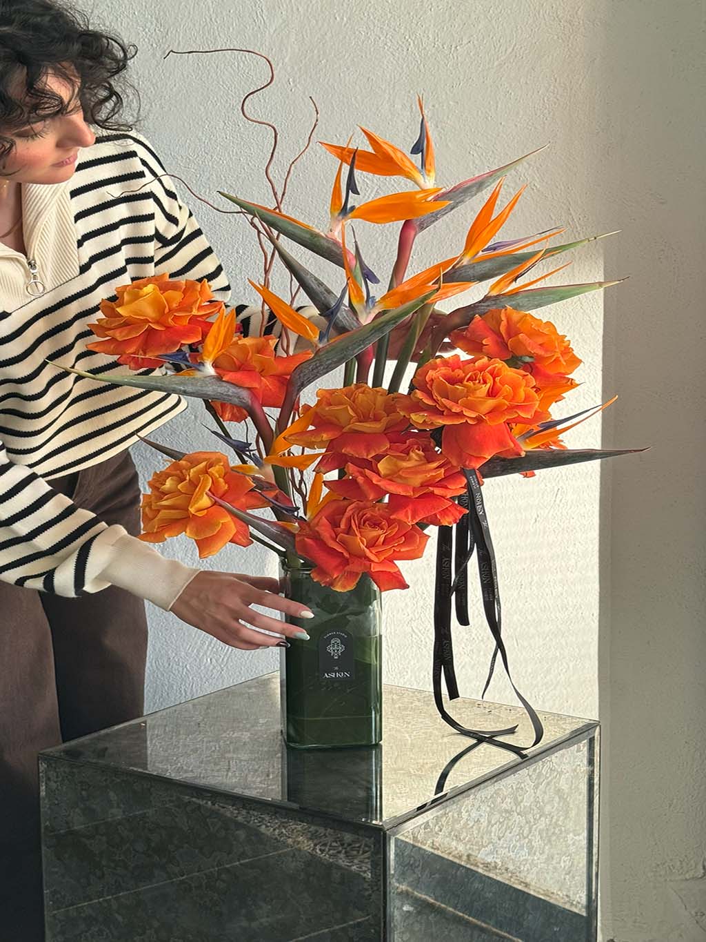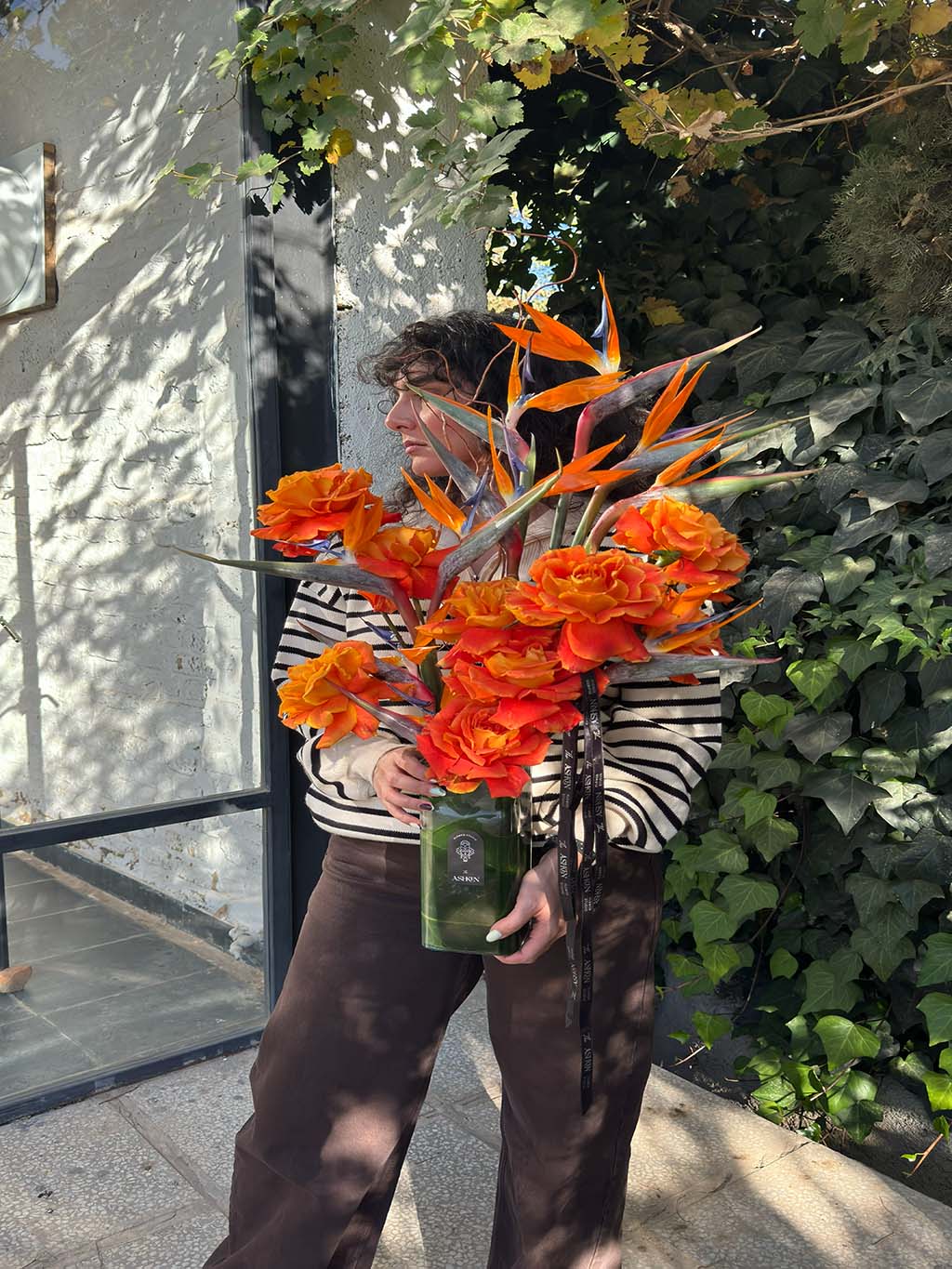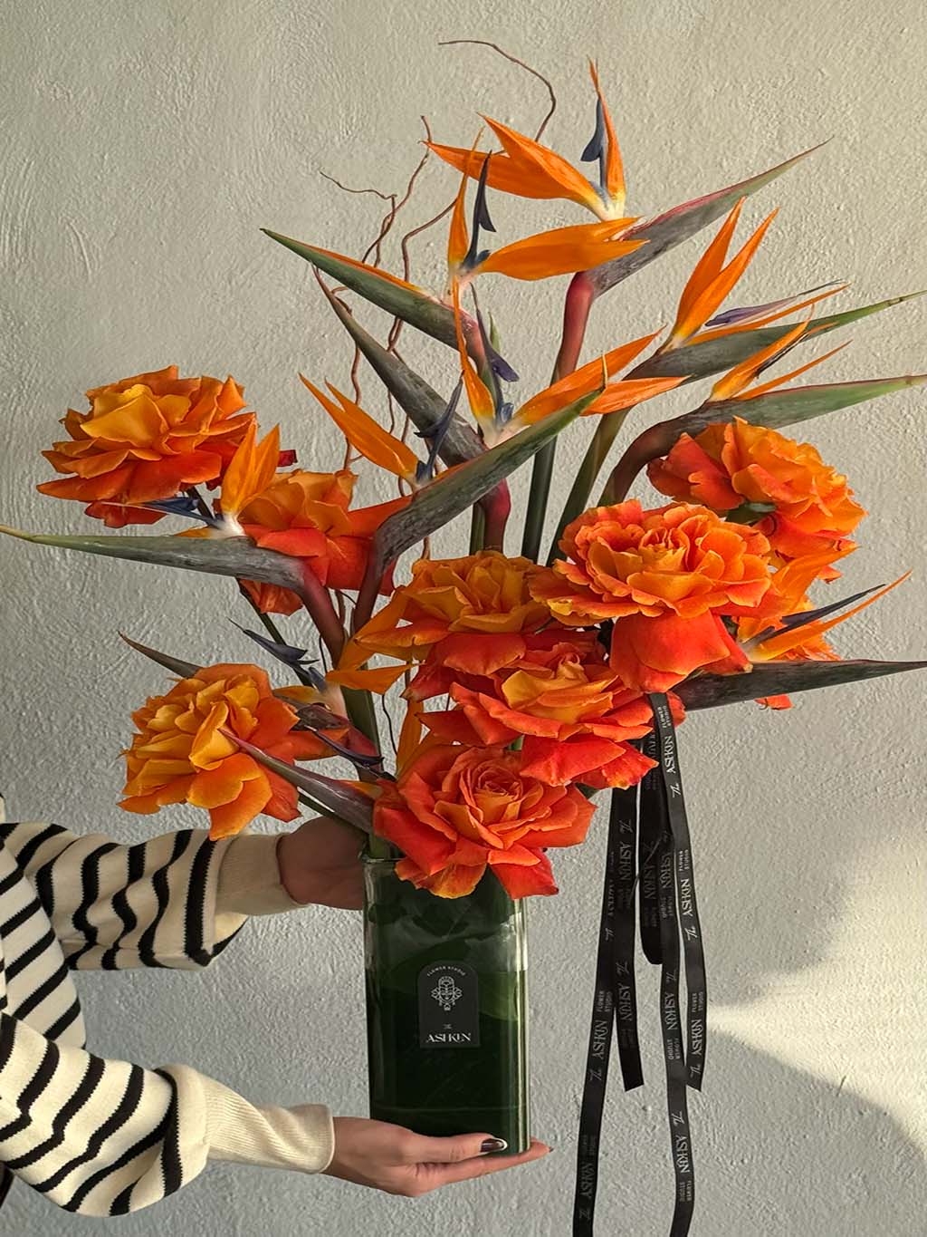 • گل‌های به کار رفته در این دیزاین: گل رز هلندی با دیزاین اختصاصی Valentine’s Secretو پرنده بهشتی