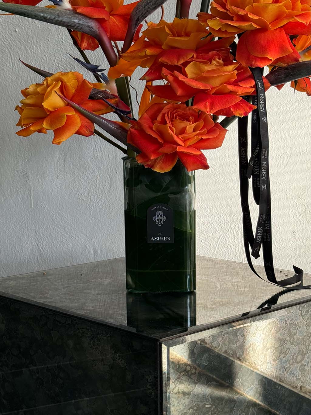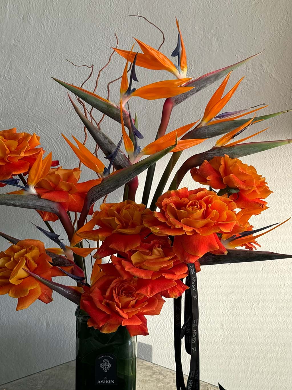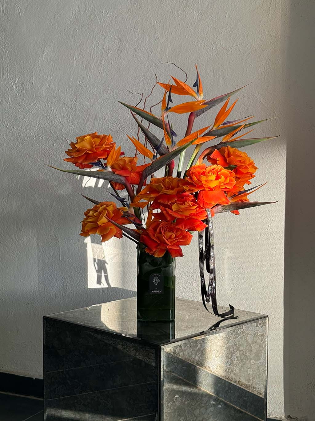 • گل‌های به کار رفته در این دیزاین: گل رز هلندی با دیزاین اختصاصی Valentine’s Secretو پرنده بهشتی