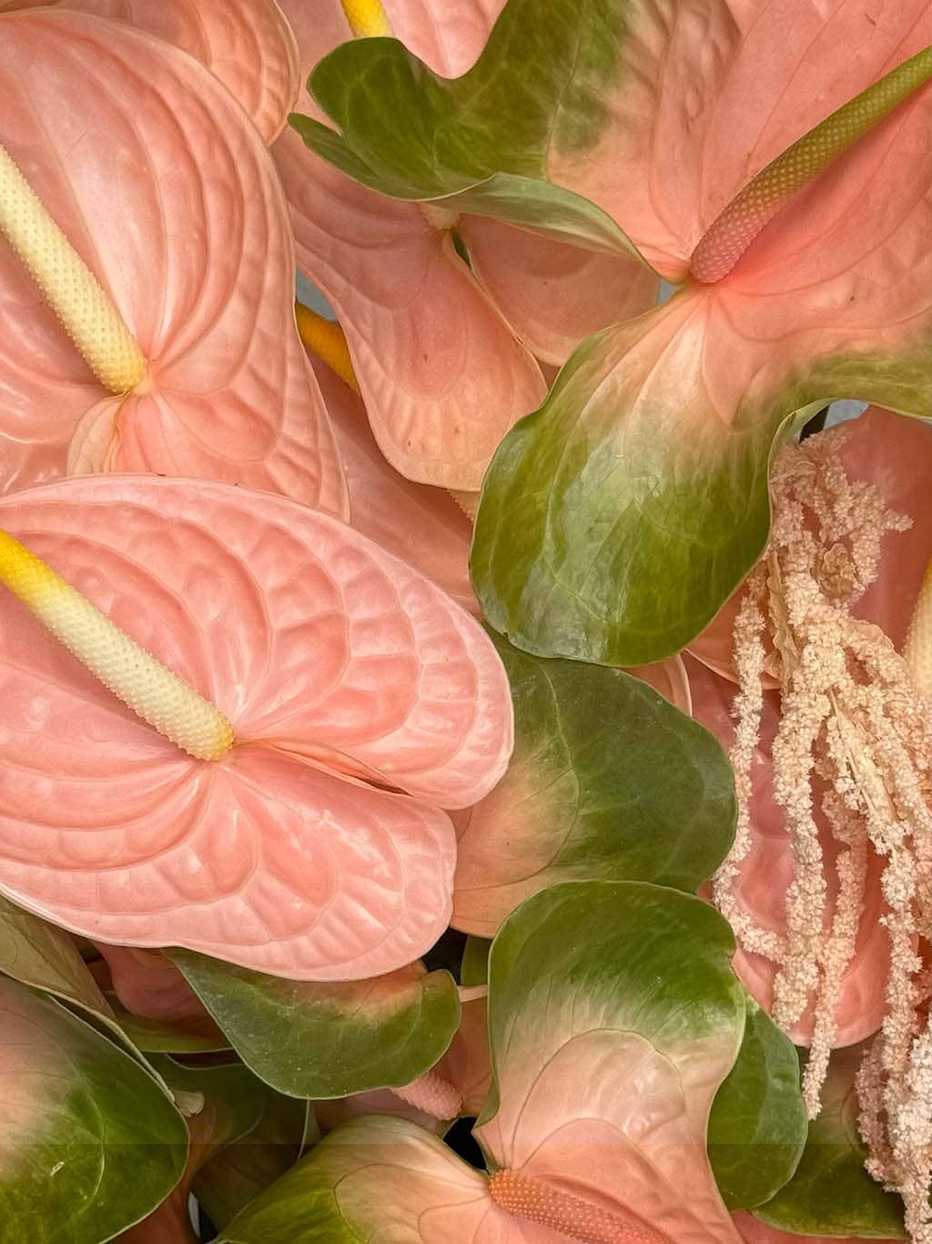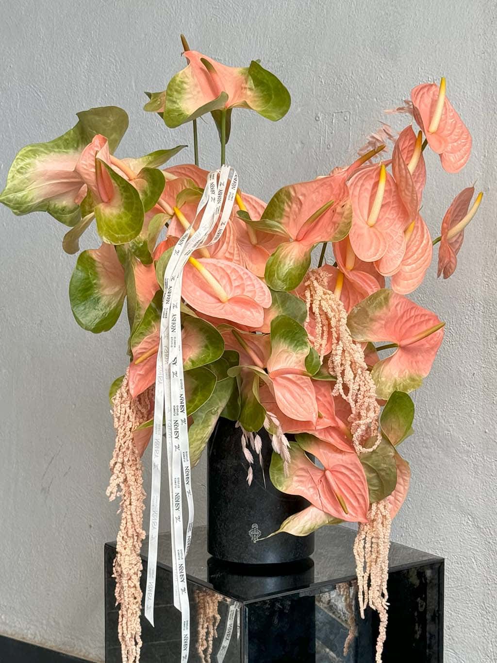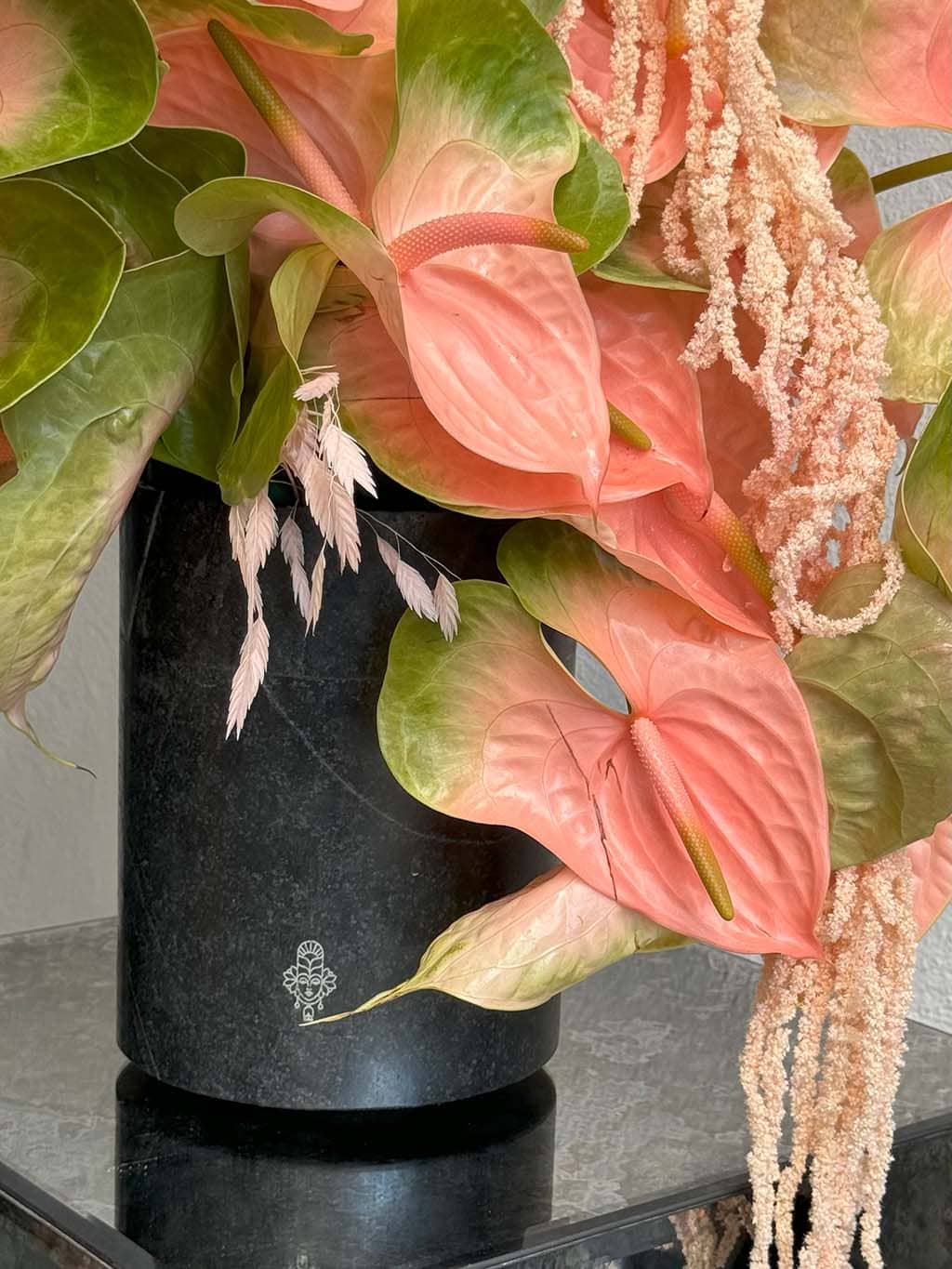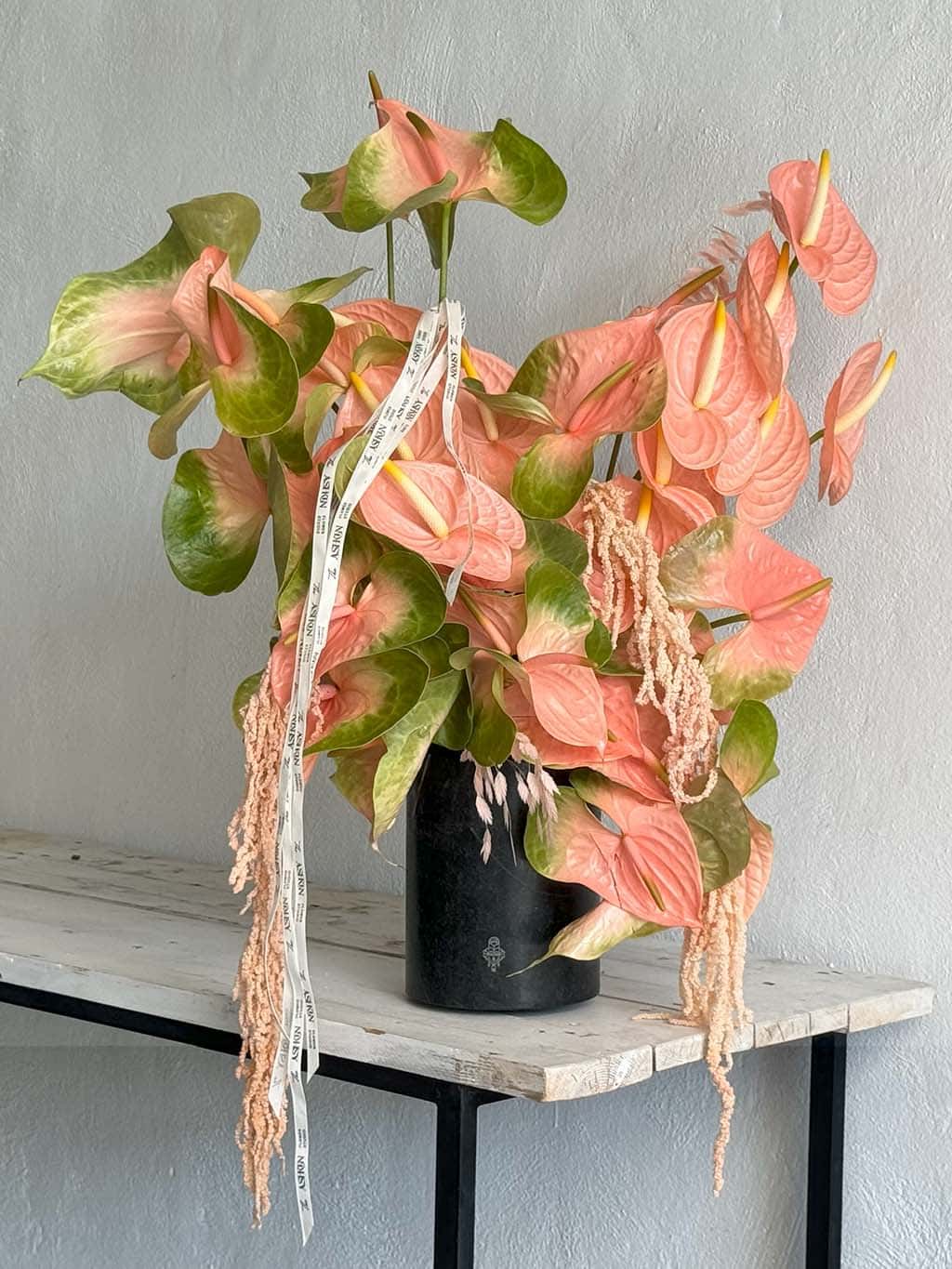 گلهای به کار رفته در این دیزاین: آنتریوم بارون، آنتریوم سانتارویال و آمارانتوس جاودان